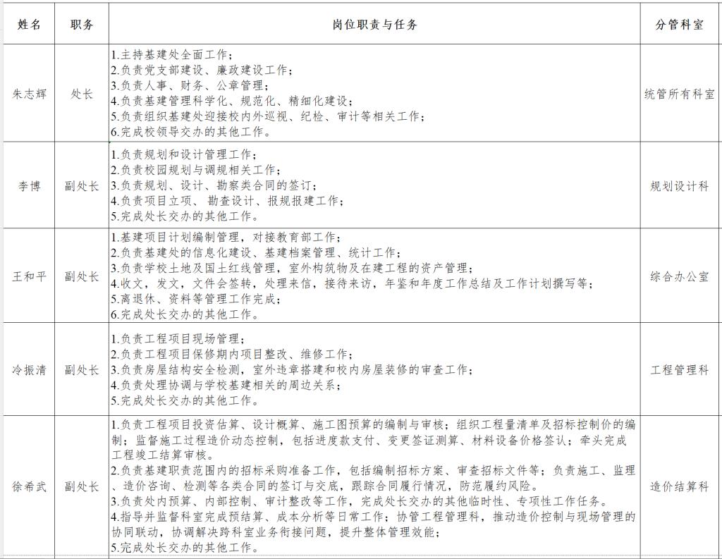 基建处领导班子工作职责及分工